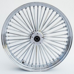 Llanta delantera cromada de 48 radios gruesos de la marca King Spoke de 21" X 3.5" para un solo disco de freno y Eje de 1". Disponibles reductores para ejes de 3/4".