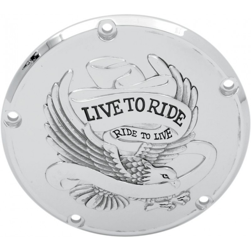 Tapa Derby Live To Ride de la marca Drag Specialties, en color cromado, para motocicletas Harley Davidson Big Twin 06-18.