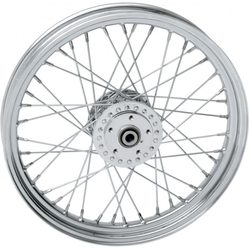 Llanta de 40 radios de la marca Drag Specialties, en medidas 19" de diámetro X 2.5" de ancho. Color cromado. Para motocicletas Harley Davidson Dyna FXD/FXR/Sportster XL 84-99.